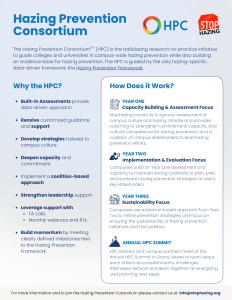 The Hazing Prevention Consortium©™ (HPC) is a multi-year research-to-practice initiative to support colleges and universities in campus-wide hazing prevention while also helping to build an evidence base for hazing prevention. The HPC is guided by the data-driven Hazing Prevention Framework.