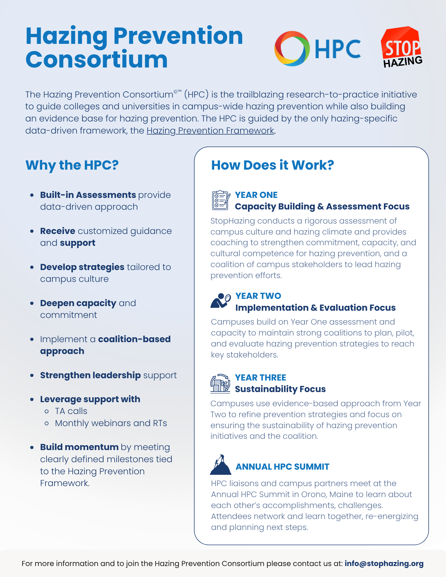HPC members work together with StopHazing’s team of research and prevention experts over a three year period, to assess campus climate for hazing and build capacity for planning, developing, implementing, and evaluating data-informed hazing prevention strategies.