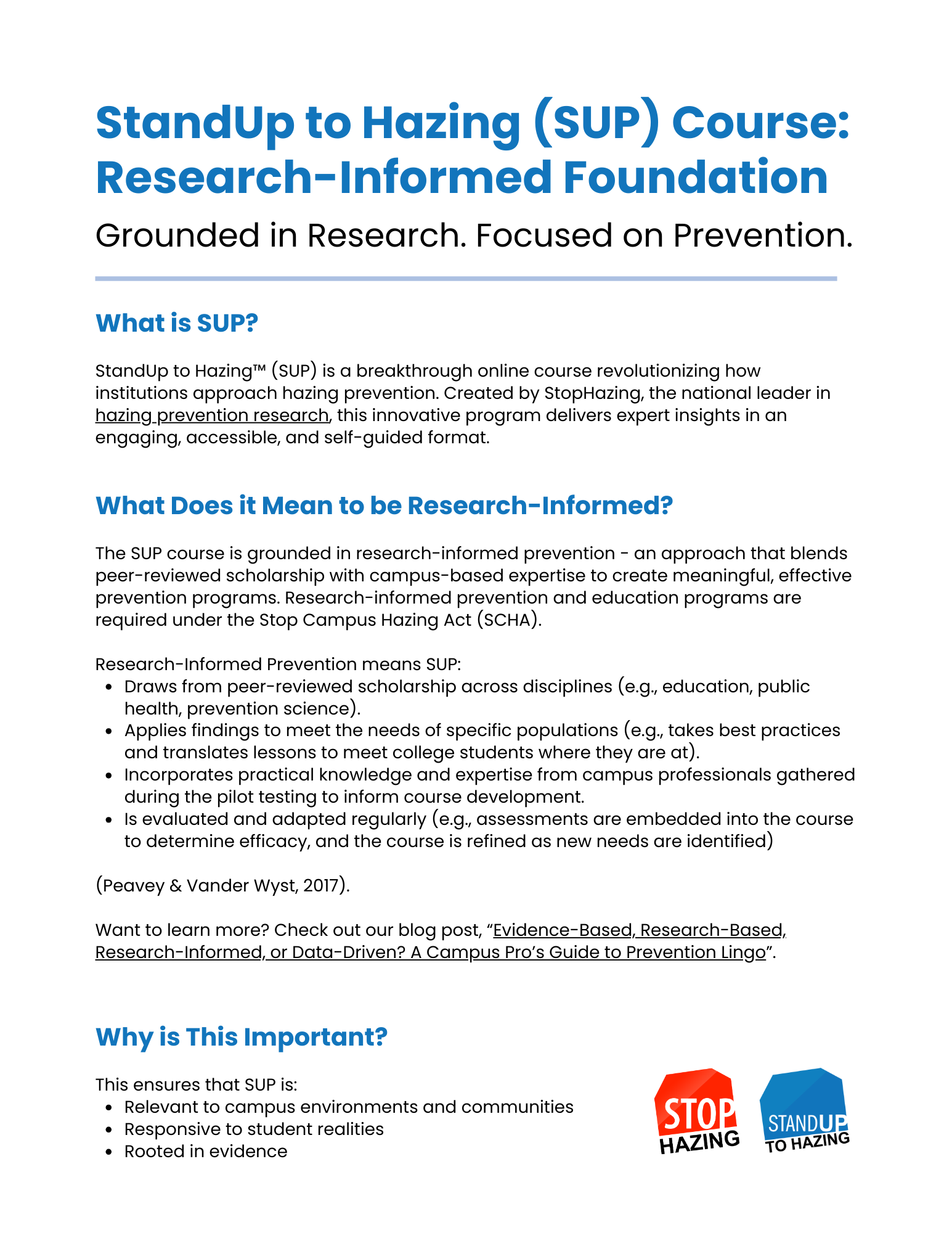 StandUp to Hazing™ is grounded in research-informed prevention—an approach that blends peer-reviewed scholarship with campus-based expertise to create meaningful and effective prevention programs. Research-informed prevention and education programs are required under the Stop Campus Hazing Act (SCHA). To see how SUP meets those requirements, check out our research-informed foundation flier below.