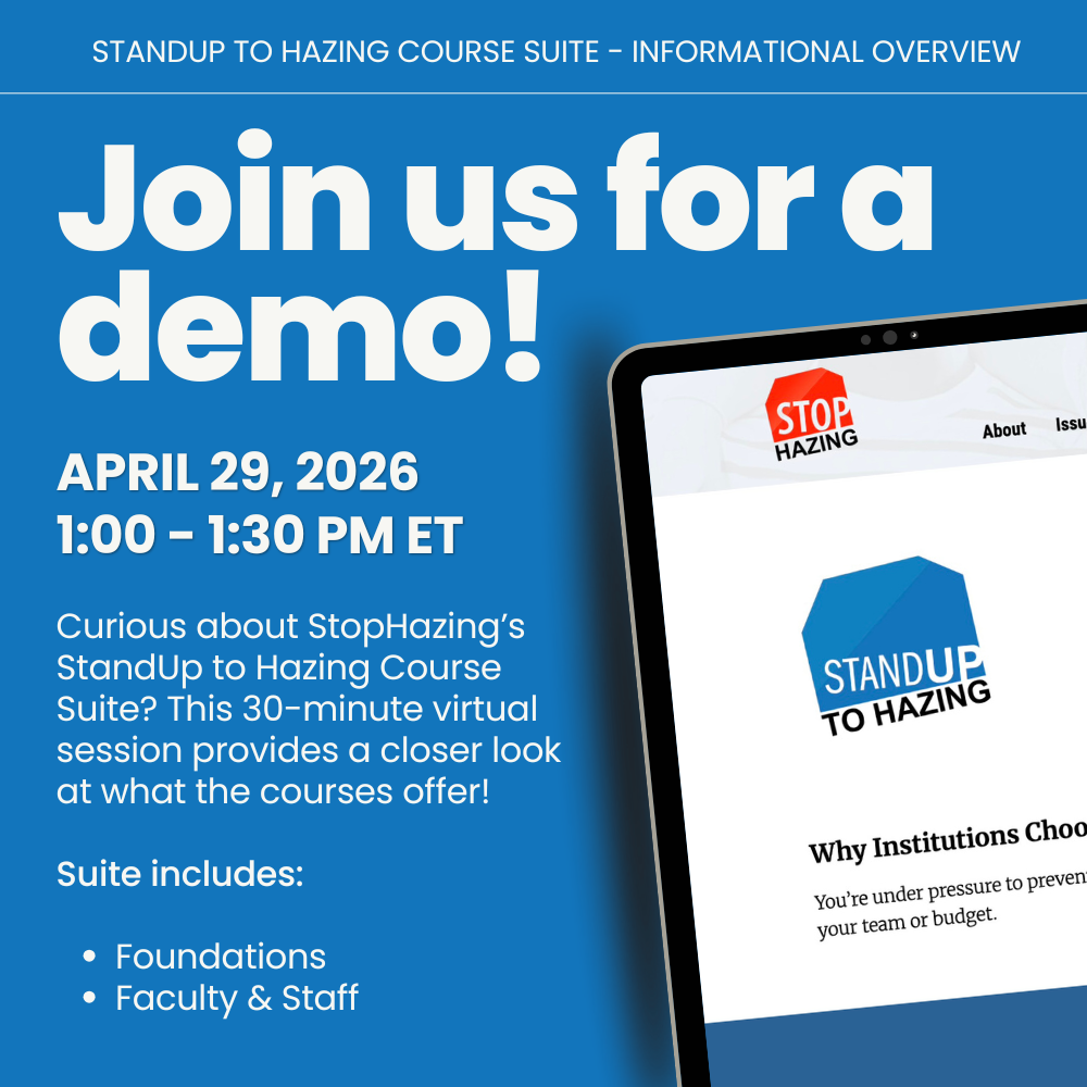 Curious about StopHazing’s StandUp to Hazing Course Suite? This 30-minute virtual session provides a closer look at what the courses offer, including their content, approach, and intended impact.